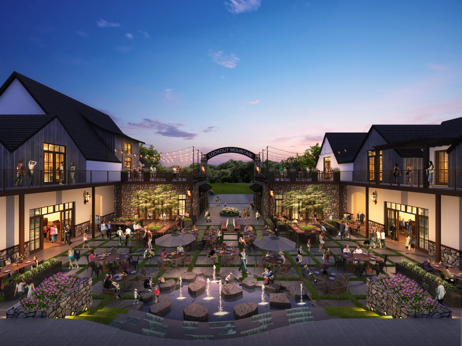 Lookout Mountain comprises of Restaurant, retail shopping & seating areas. Main highlight is the courtyard area which is the interaction space for adults to chill out & stroll for a evening walk with there pets. Kids can play with water fountains and old can relax at benches and enjoy there snacks, dinner surrounded by nice landscape. Roof patios are another highlight where gatherings can happen with friends and family!