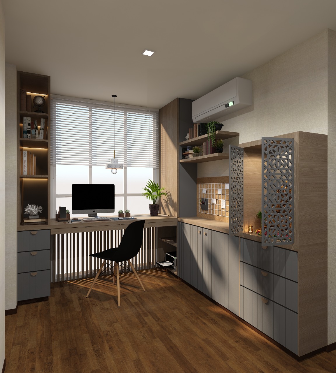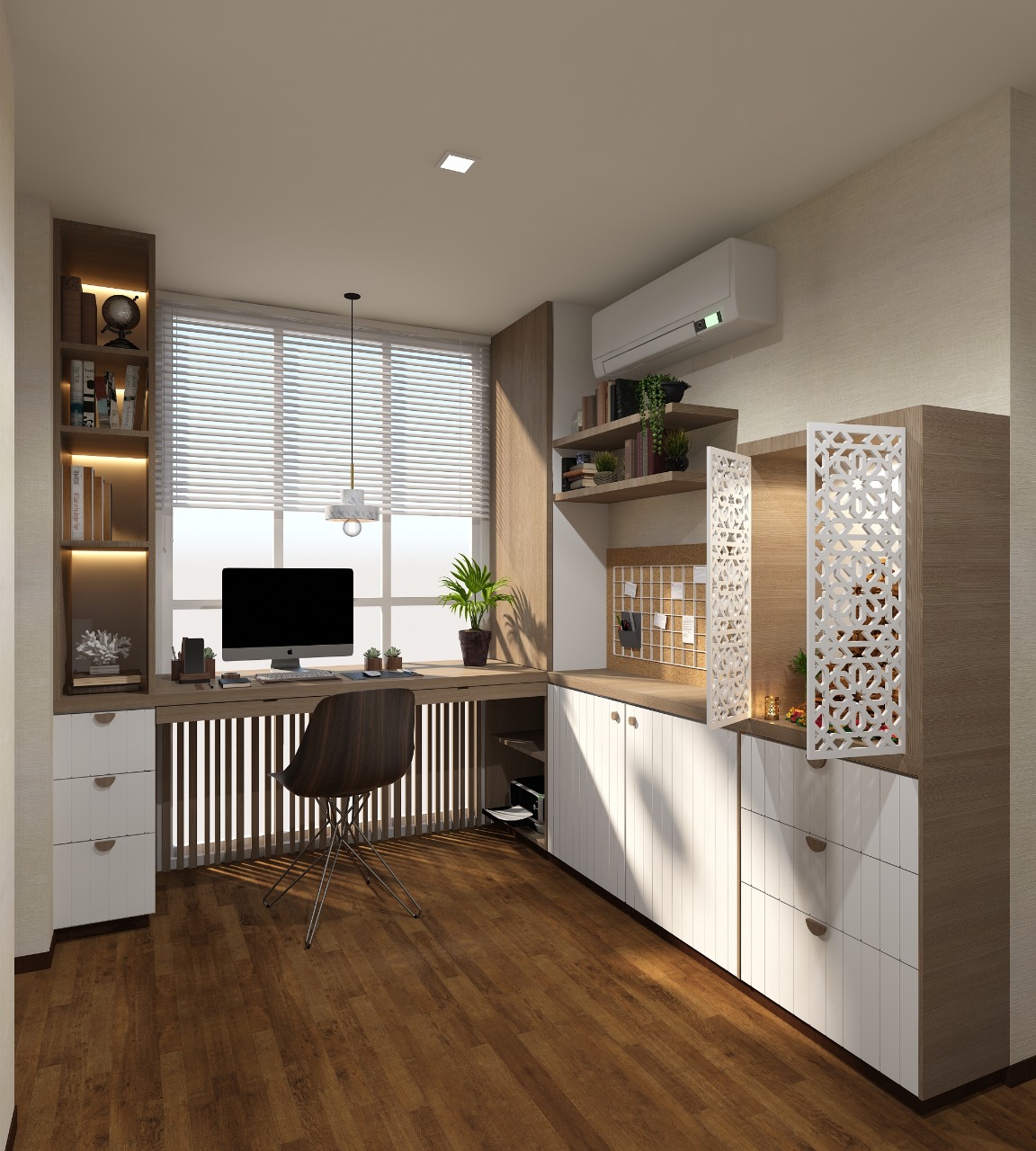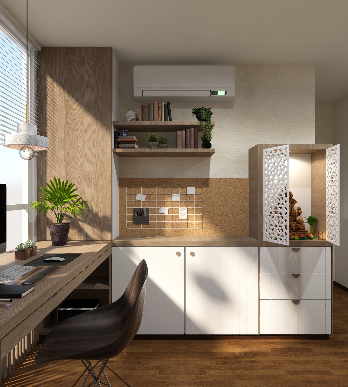 This project was quite challenging due to few reasons, space constraint and to fit study and prayer together and must blend together too with the existing design. HiVAR met client’s requirement of Study area, storage, along with some open shelves and temple for prayer. Design was executed in such a way to match with existing elements, materials and texture. Lighting also was relooked based on the new design.